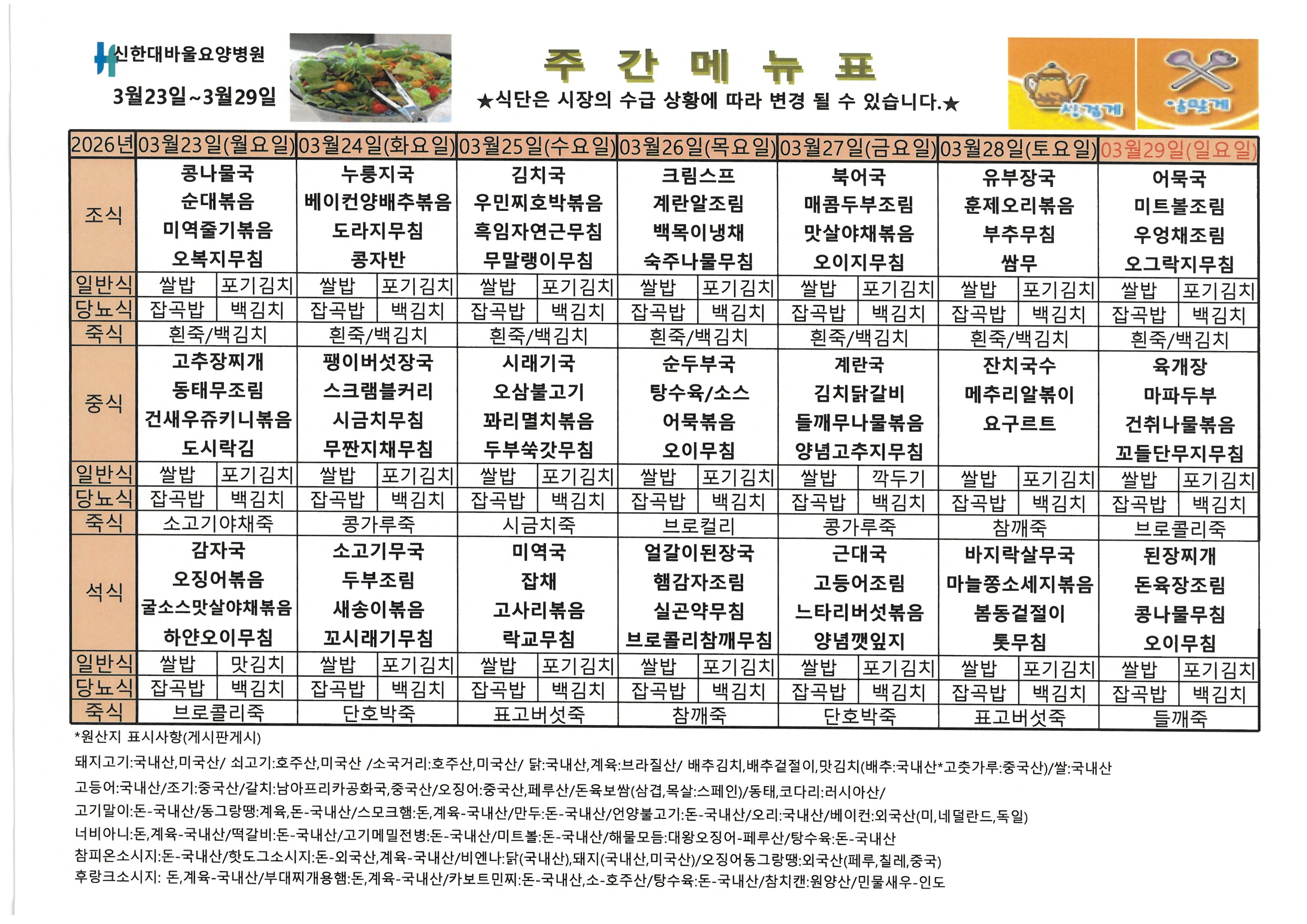 신한대바울요양병원 3월 1주차 식단