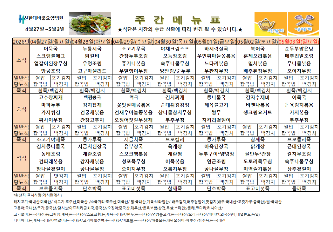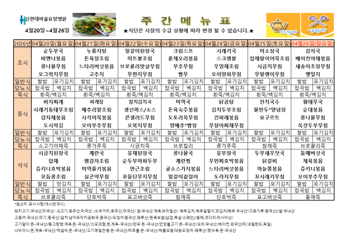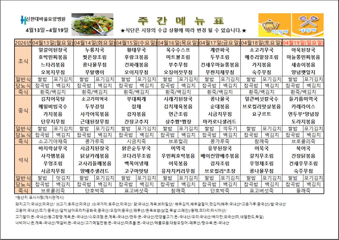 신한대바울요양병원 4월 3주차 식단