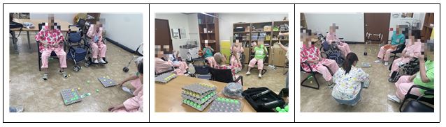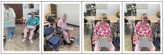 둘째, 넷째 주 인지운동프로그램은 달걀판에 탁구공6개를 올려두고 위로 던지며 자리를